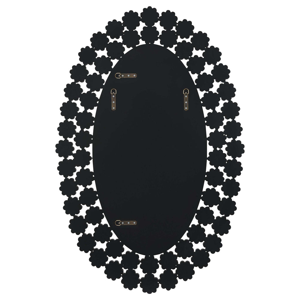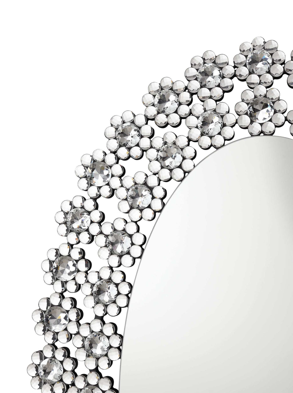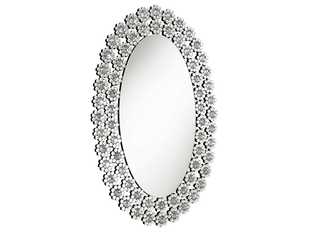 Elegant shapes and sparkling finishes merge to create this breathtaking oval mirror . Surrounded in a glimmering display of floral-inspired, crystal-like blossoms, this elongated, contemporary mirror provides a room the refined sophistication and luxe details it needs. Mount this stunning mirror in an entryway foyer for a dramatic look. Or simple hang it above a pedestal vanity in a powder room to reflect light and shine back at guests. A clean reflective mirror surface lends a sleek, modern touch too.