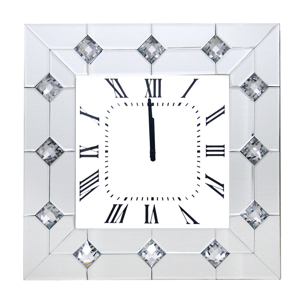 The Hessa mirrored wall clock will catch the attention of every guest. A square mirrored frame with shiny crystals, the clock face has a clean, modern look featuring roman numerals. This masterpiece will not only be functional but also the most stunning decoration of any room.