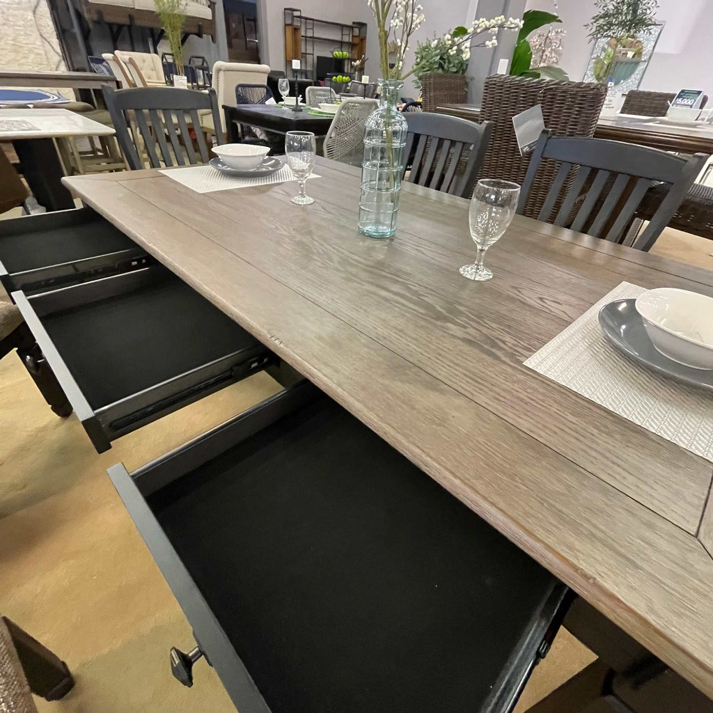 Set your sights on this dining set. The rectangular table, with six drawers for storing away smaller items, beautifully suits your storage needs. Its timeworn planked oak top creates a unique two-tone contrast, while tapered legs feature a sturdy foundation. The heavily textured black and oak finish is trend-right urban farmhouse style. Four solid wood upholstered dining chairs with slat backs complete this winning combination.