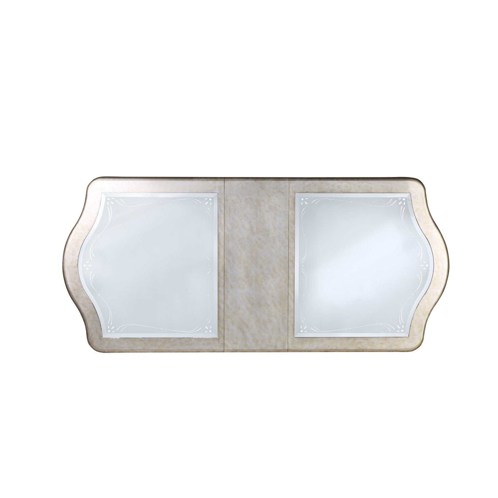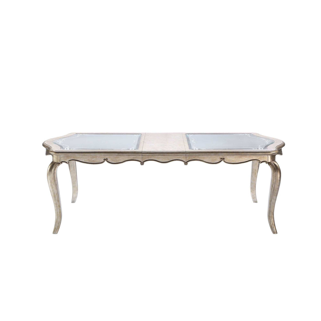 Every piece in the Esteban dining collection reflects vintage glam style! Gorgeous details such as raised scroll trim and crystal handles with mirrored fronts on the case pieces transform the entire collection into something extraordinary. The antique champagne finish and the mirror inlayed on the table top elevates this set to the height of luxury.