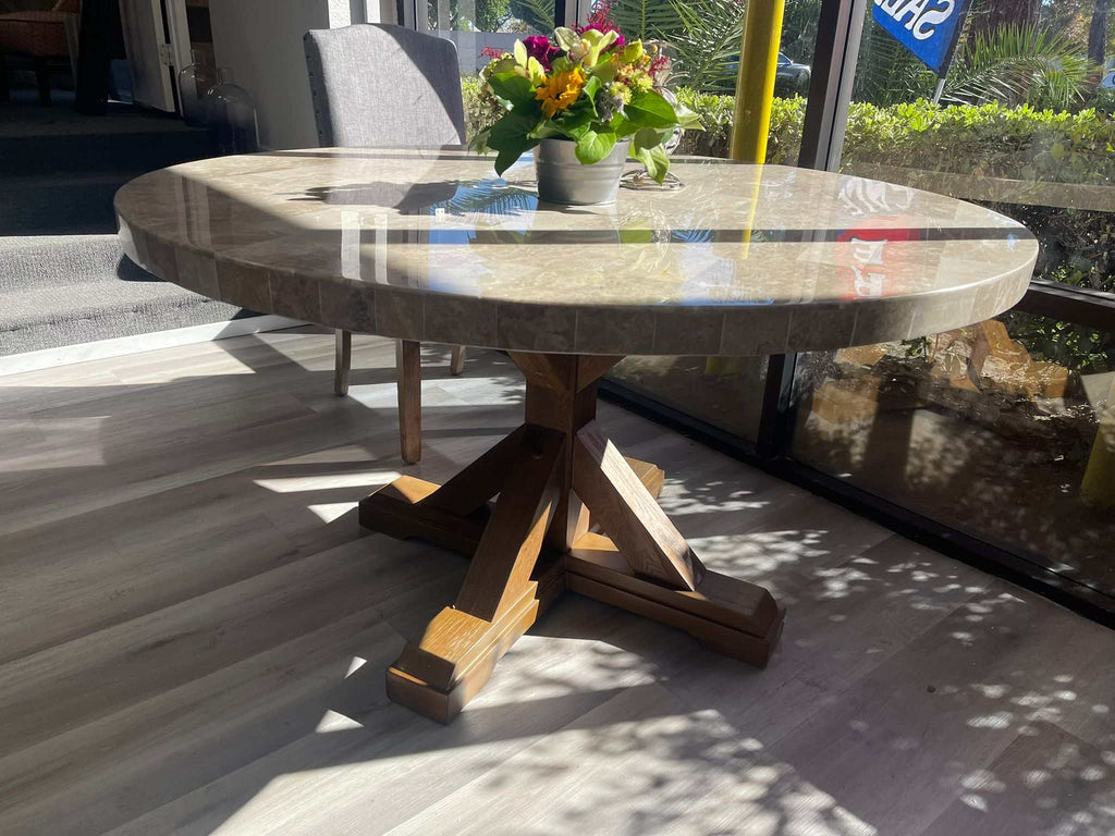 The Vesper Beige Marble & Brown Round Dining Table is a round dining table constructed from Marble and Solid Ash Tree Wood that provides a durable and stylish centerpiece for your dining area. This table blends old and new elements, resulting in a polished and sturdy design that mixes styles, colors, and materials for a modern dining group.