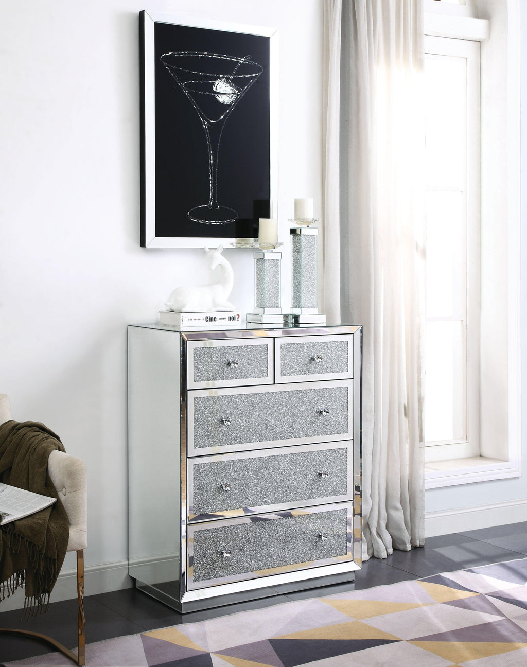 - Rectangular Chest - Storage: 5 Drw - Mirrored Top, Front Drawers with Faux Crystals Inlay - Mirrored Case with Beveled Edge - Collection Rekha