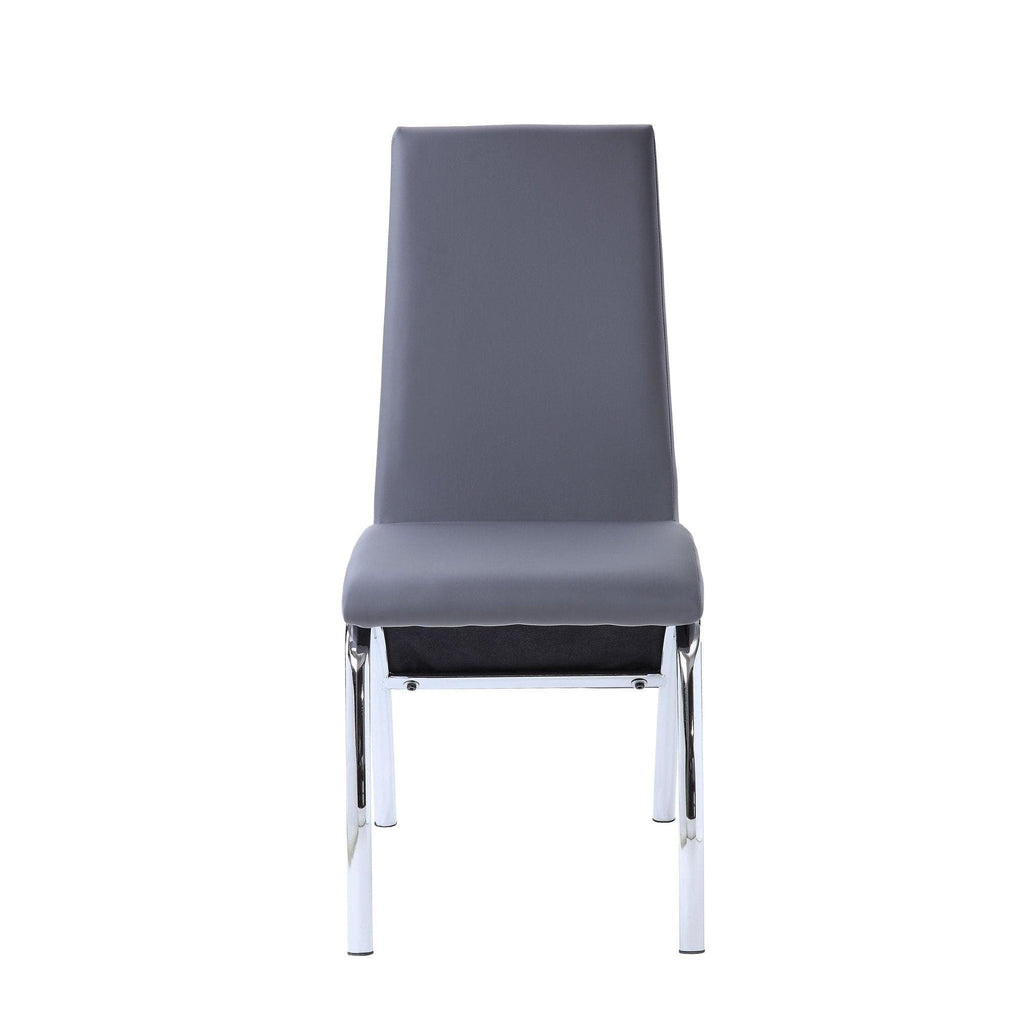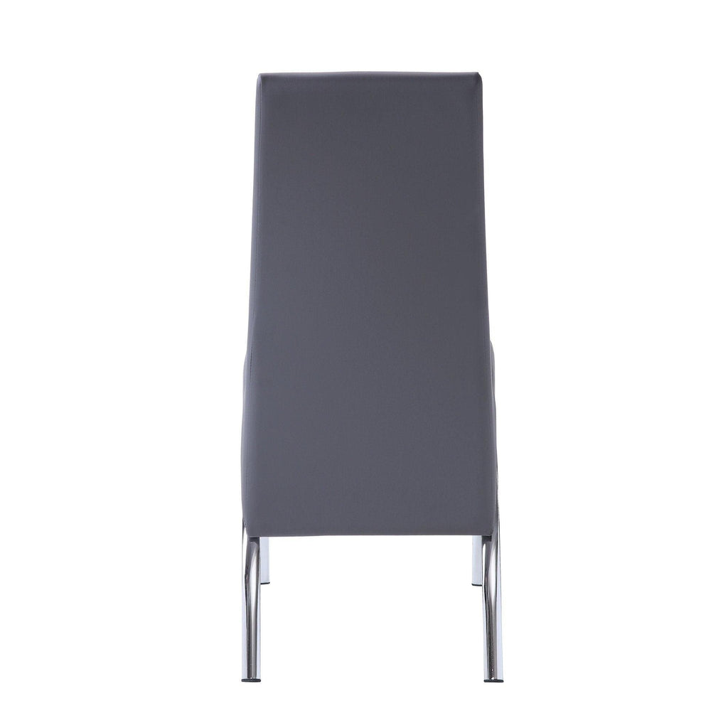 Add a modern touch to your dining room with the Noland dining room collection. With clear tempered glass legs serving as the table's base, this beautiful rectangular dining room table doubles as a piece of art for your dining room. The table stunning high gloss finished top and modern glass legs will keep your room feeling open and refined. This sophisticated dining room table has unique armless chairs with curved chrome legs and fully padded seat and backrest in faux leather upholstery.