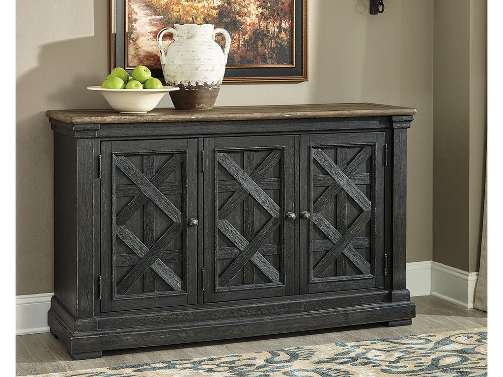 Invite your family into the heart of your home with this dining room server. Its beautifully textured black finish and timeworn planked oak top create a unique two-tone contrast. A charming lattice design graces the front of the doors. Thick pilasters add to the sturdiness of the foundation. And cabinets offer plenty of storage space for essentials. This is trend-right urban farmhouse style.