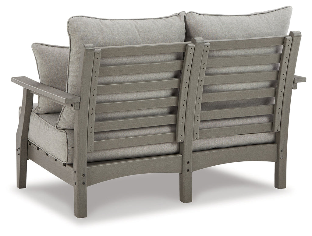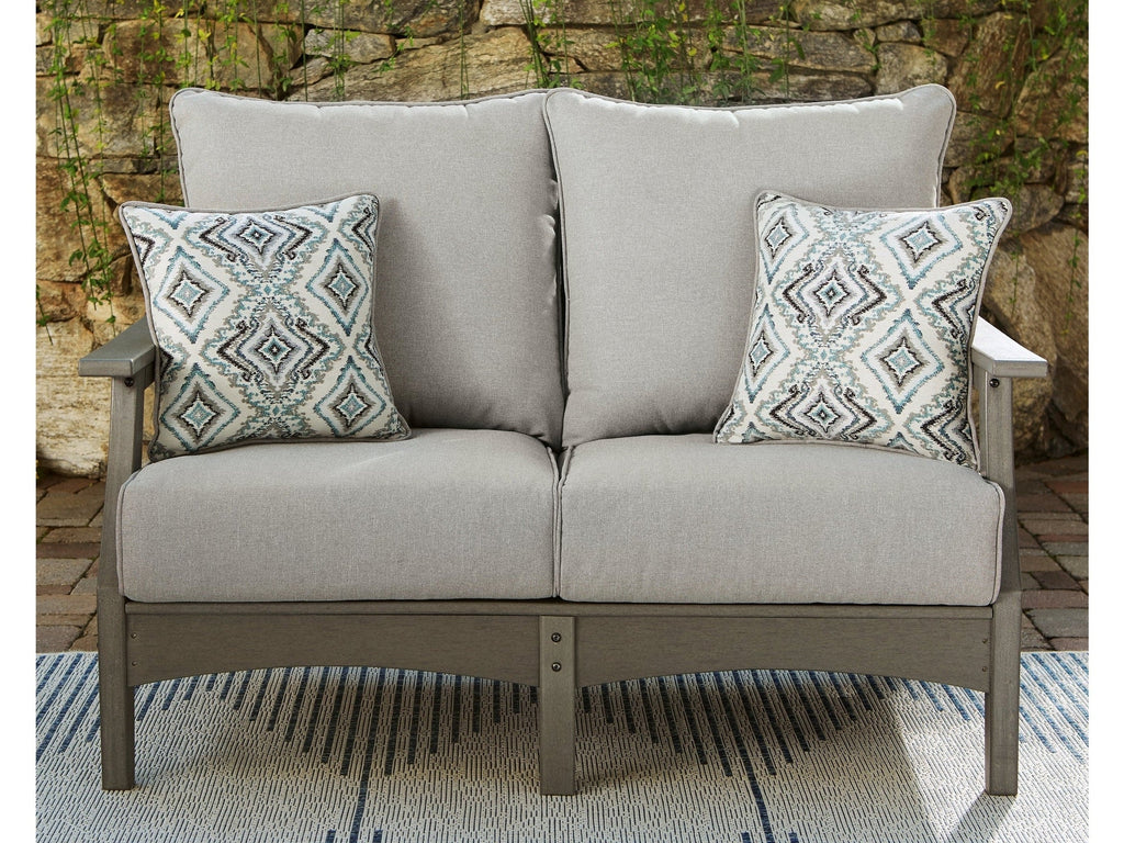 It’s the dawn of a new day for gray. Embrace the style trend with this outdoor loveseat. Crafted of HDPE material that combines the exceptional durability and weather resistance you need with the “wood look” you love, this comfortably cushioned loveseat takes outdoor living to a whole new level. Rest assured, the thick seat and back cushions and throw pillows are wrapped in our exclusive Nuvella® high-performance fabric that’s fade resistant, stain resistant and a breeze to clean.
