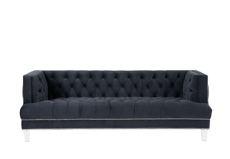 Sophistication meets modern with the Ansario living room collection. The rich blue velvet adds character to any room. Showcasing a square back, high arms, and nail-head trim, feature button tufted accents. The acrylic legs give off a modern vibe to the pieces. The full foam seats ensure that your next TV binge will be done in complete comfort.
