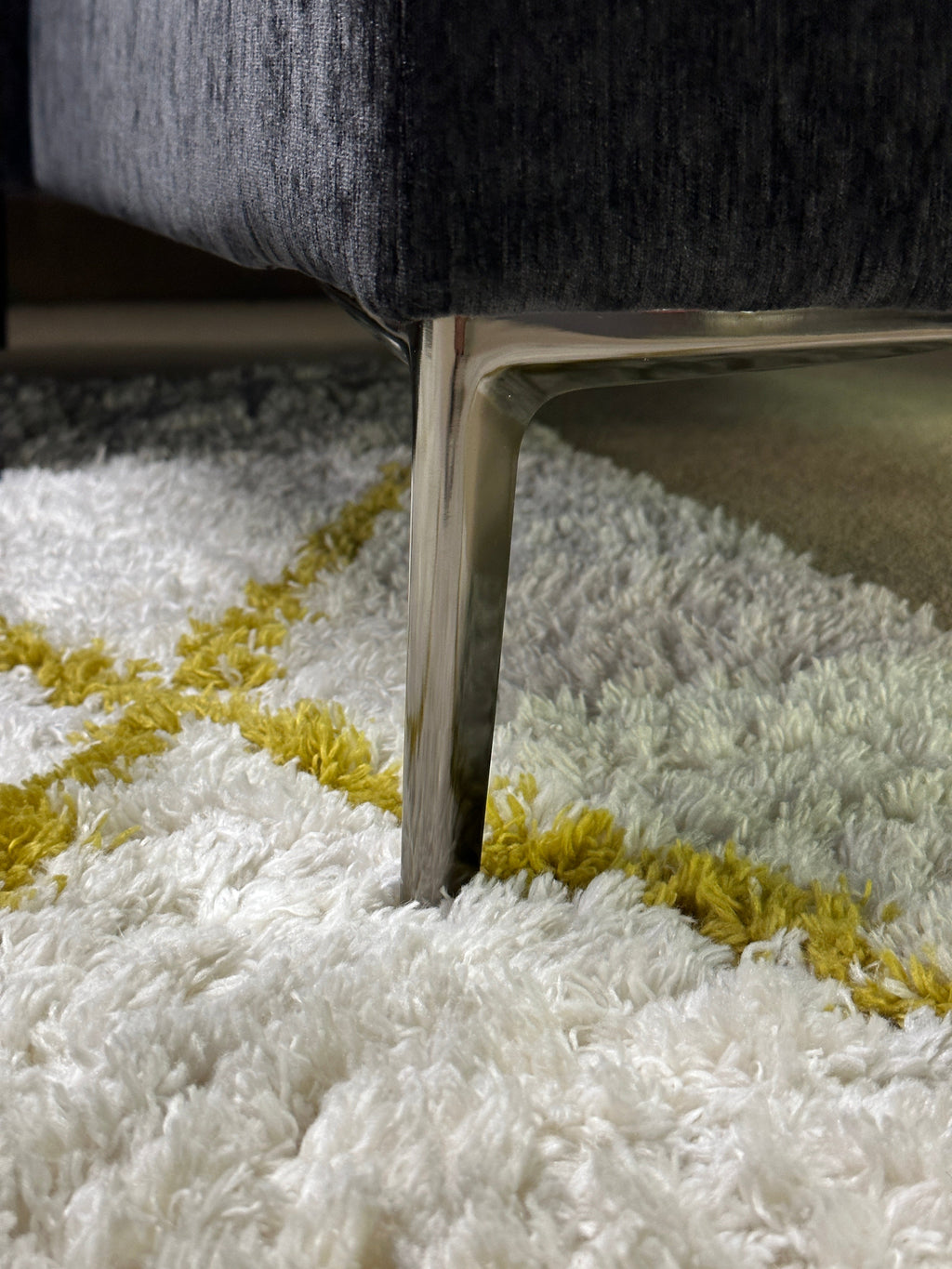Sitting perfectly among contemporary pieces, the Azariah sectional is a bold interpretation of the modern lifestyle. Unapologetic in its color, the piece is upholstered in black and gray chenille, while supported by smoke-plated metal legs. Modern additions like the low profile pillow arms and two chaises instead of one allow for maximum comfort. With its bold color and sleek styling, it’s hard not to make this piece the center of one’s living space.