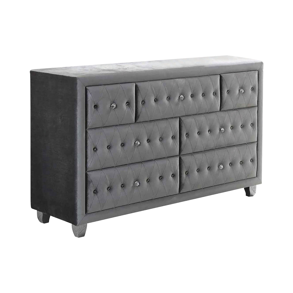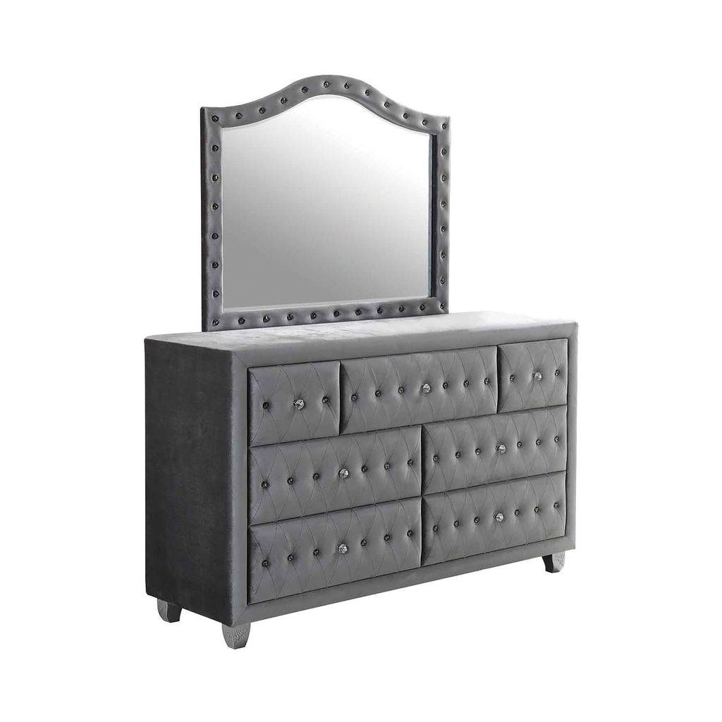 Lush and luxurious, this dresser makes a stunning statement. Its gorgeous, metallic grey finish boasts a soft texture and a subtle sheen. Elegant tufting adorns its drawers for a touch of updated style. Round, crystal-like drawer handles complete its look with a lovely hint of sparkle. Topped with a gorgeous matching mirror, this dresser is simply magnificent.