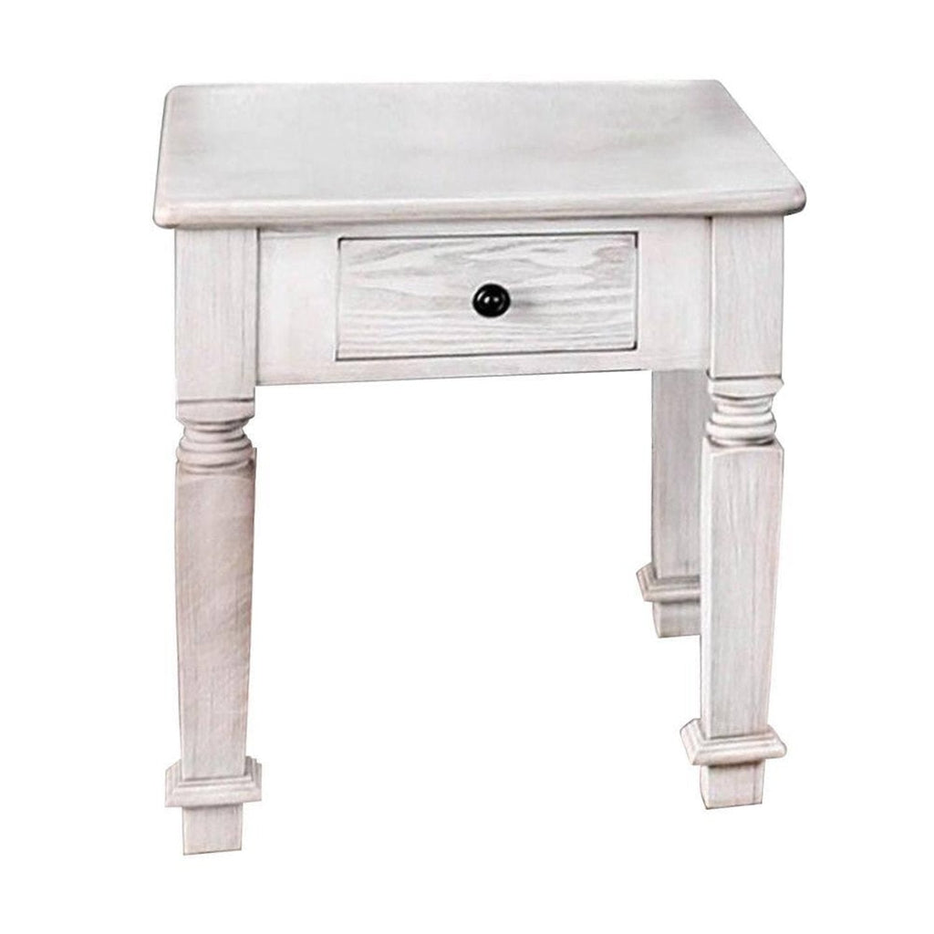 Introduce a bit of rural charm to your home. The carved Remington styled legs are a classic component of country styled furniture, here they come to life. The little drawer pulls reveal a handy storage space for small keepsakes and a convenient spot to store everyday used things like remotes. This wooden table comes finished in a handsome antique white, the wood grain pops at every twist and turn of the piece.
