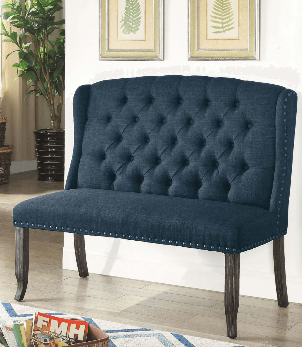Complete with a stylish wingback design and sleek nailhead trim, this loveseat bench offers a comfy alternative for your dining arrangement! Long tapering legs provide plenty of support for the seat while the button tufted backrest lends even more visual appeal to the contemporary silhouette.